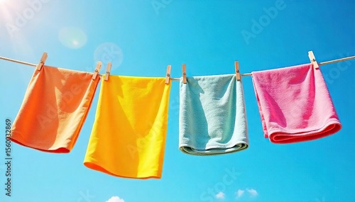 Summer Clothes and Towels Drying in Sunshine on Clothesline, Bright Blue Sky, Fresh Laundry, Outdoor Living