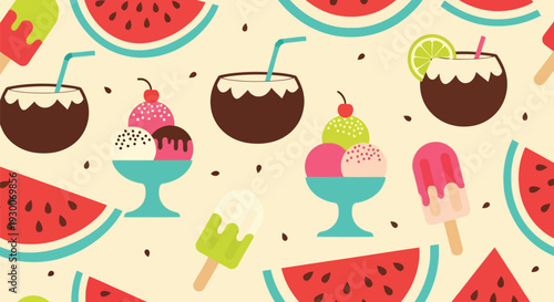Summer dessert vector pattern with watermelon, ice cream, coconut, and popsicles seamless background