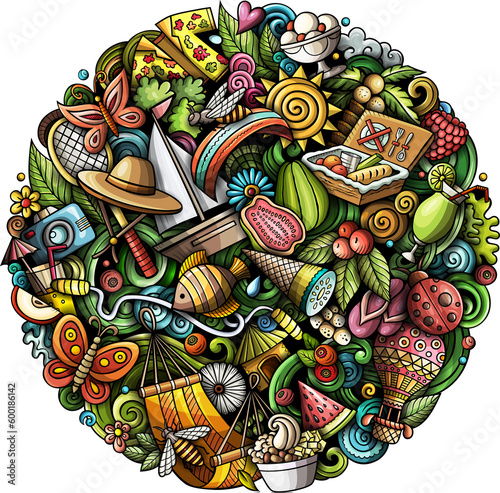 summer, activity, season, leisure, summer, lifestyle, vacation, nature, camping, picnic, food, holiday, joy, park, recreation, rest, vale, village, weekend, cartoon, doodle, design, illustration, funny, round, decorative, background