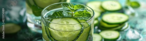 Summer drinks, Refreshing cucumber and mint infused water in a glass.