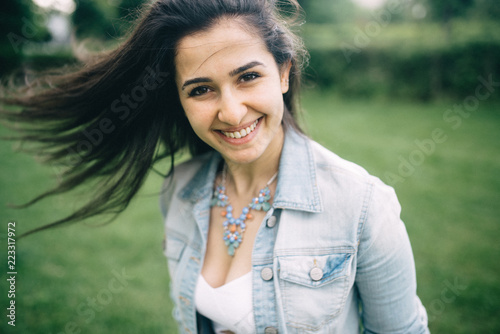 woman, portrait, young, beautiful, beauty, summer, happy, outdoors, nature, park, smiling, green, face, smile, hair, fashion, person, cute, grass, people, 1, closeup, brunette, day, girl, laughter, joy, mood, emotion, wind, street, sun, vacation, rest, walk, emotion