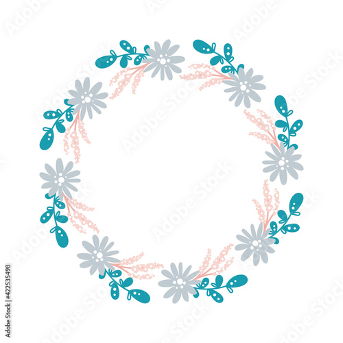 Summer flower herb wreath scandinavian. Spring Flat abstract vector garden frame, woman day romantic holiday, wedding invitation card decoration. Element summer floral isolated illustration