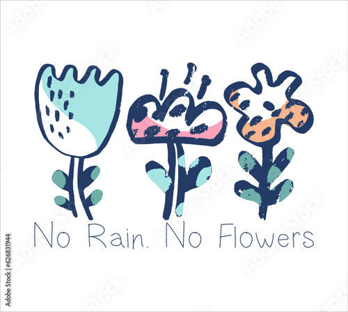 Summer flower t-shirt print with slogan. No Rain, No Flower. Abstract flower, organic shape.