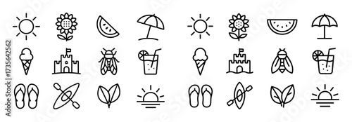 season, summer, sunshine, sunflower, beach umbrella, ice cream cone, cicala, flip-flop, kayak, green leaf, linear, icon, black, vector, graphic, isolated, minimal, icon, modern