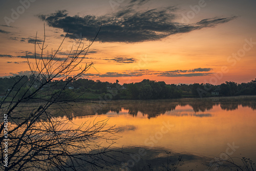 sun, fog, morning, dawn, sunrise, landscape, nature, duck pond, lake, spring, summer, sky, cloud, river, plant, grass, leaf