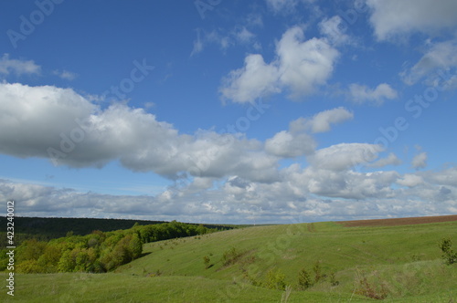 summer landscape: green hill, green trees, blue sky with white clouds, cell phone tower.
