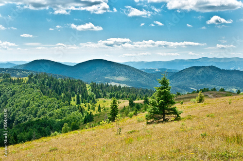 mountain, summer, green, sky, blue, carpathians, day, field, panorama, view, grass, pine, outdoors, scene, white, colours, woody, attractively, tree, nobody, greenery, massif, seasonal, excursion, bright, sunny, scenery, cloud, countryside, fur-tree, wood, cloudy, pasture, beauty, ukraine, country, coniferous, nature, idylli, ground, vacation, europa, landscape