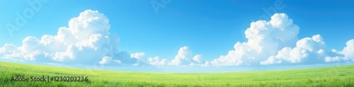 Summer landscape with white and puffy clouds in the clear blue sky, Atmospheric, Natural