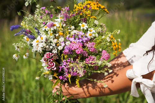 Summer lifestyle portrait of beautiful brunette woman holding in her hands bouquet of wild flowers. Enjoying sun. Happiness and love concept. Beautiful flowers. Romantic mood. Sunny day on the nature