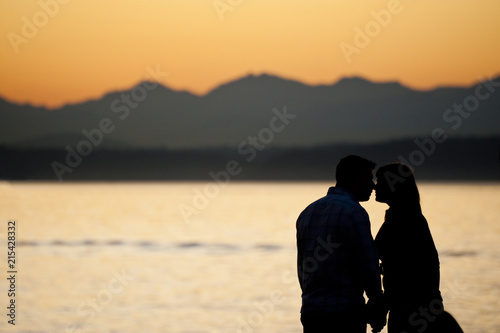 Summer Love on Alki Beach, West Seattle, Washington. A couple pauses to watch a dramatic sunset and possibly steal a kiss. The Olympic mountains are seen in the background.