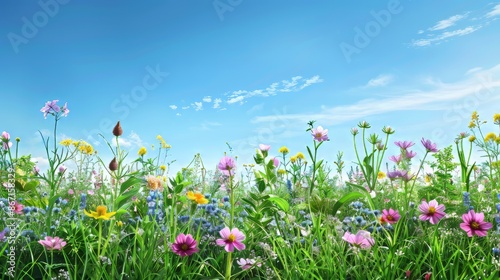 Summer meadow adorned with colorful wildflowers, lush green vegetation, detailed and vibrant, clear blue sky, tranquil and picturesque setting