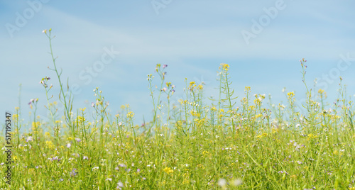 Summer meadow background. Spring green field with wild flowers and herbs on sunny sky background.