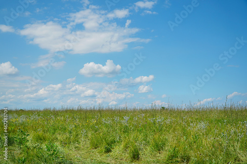 Summer meadow with juicy herbs for mowing on a clear sunny day against a blue sky with clouds