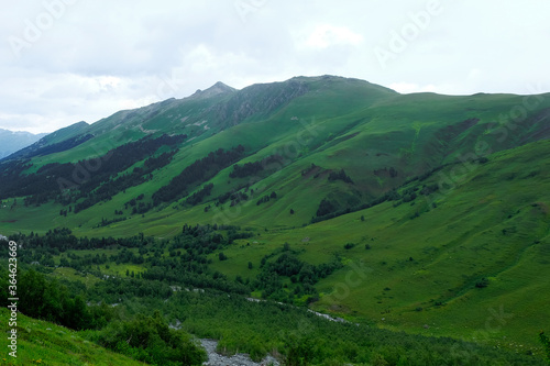 Summer mountains green grass and blue sky landscape. Caucasus mountains