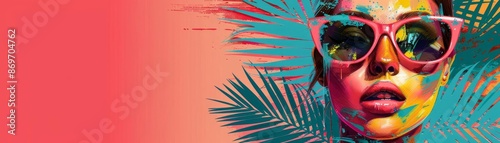 summer, party, flier, girl, sunglasses, palm, leaves, colourful, stroke, face, template, modern, tropical, youthful, stylish, attractive, sunset, download, concept, social, decor, background, lively, poster, holiday