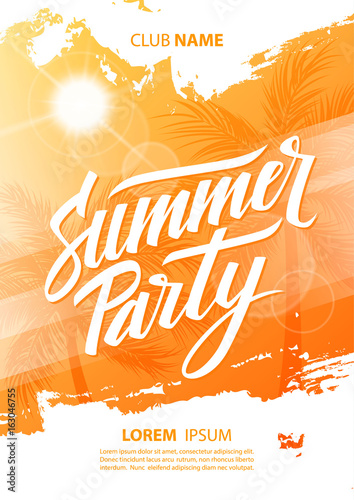 Summer party poster with hand lettering and palm trees. Vector illustration