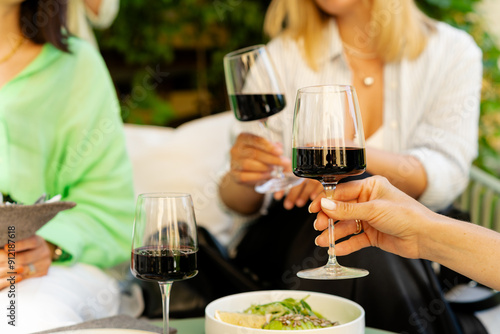 Summer party with red wine. Friends drinking wine