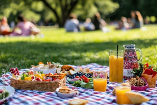 picnic, blanket, chequered, tablecloth, red, blue, green, grass, outdoors, food, snack, salad, tomatoes, blueberry, cheese, bread, fruit, nut, walnut, drink, juice, goggles, pitcher, orange, summer, sunlight, bright, vibrant, fresh, tasty, delicious, relaxing, friends, family, gathering, celebration, nature, park, tree, leaf, summer, refreshment, leisure, enjoyment, happiness, joy