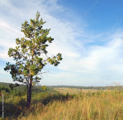 background, beauty, blue, tree branch, cloud, colours, descriptive, environment, field, grass, green, heaven, herb, high, hill, land, landscape, large, meadow, nature, needle, outdoors, over, pine, plant, single, sky, skyward, solitude, spring, summer, tall, tree, treetop, trunk, wilderness, yellow