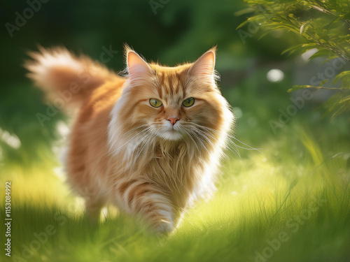 summer portrait of a fluffy Siberian red cat walking on nature in garden on background of green grass