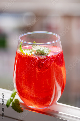 Summer refreshing cocktail with strawberries, ice and fresh mint leaves.