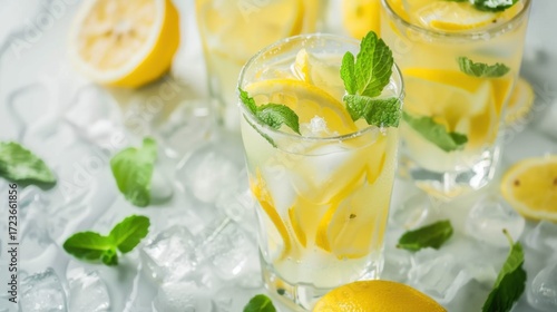 drink, glasses, lemon, green, juice, fruit, food, ice, cocktail, lemonade, cold, fresh, white, healthy, water, lime, beverage, alcohol, citrous, soda, slice, isolated, smoothie, tea, mint, yellow, orange, refreshment, summer, refreshing
