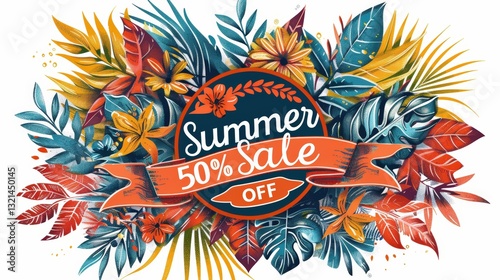 summer, sale, discount, tropical, flower, leaf, floral, graphic, design, promotion, 50, off, special offer, floral pattern, tropical flower, graphic design, illustration, background, image, vector, poster, flier, booklet, marketing, advertising, decorative, digital illustration