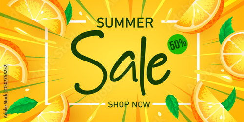 Summer Sale poster or banner template with Colorful slices of Orange fruit. Promotion and shopping template for Summer season.