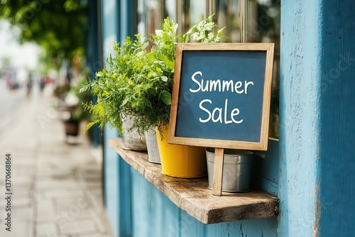 Summer sale sign displayed outside a shop with potted plants showcasing vibrant greenery and inviting atmosphere promoting seasonal discounts concept