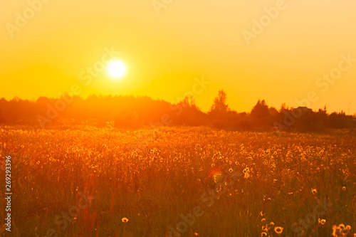 Summer sunset in the field. Evening field. Field with grass and wildflowers. Ray of sunshine