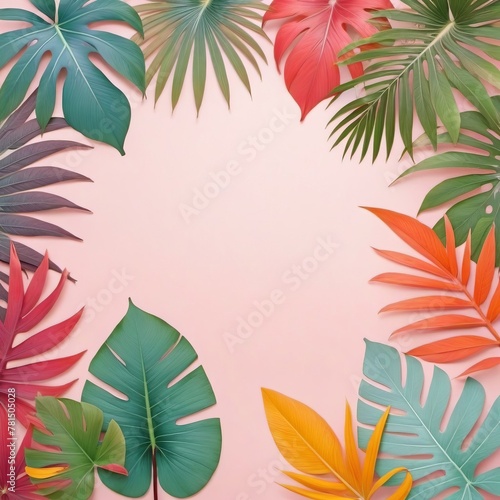 Summer time, frame background, template, tropical leaves on pastel background, copy space, top view.