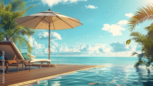 Summer vacation at poolside. Veranda decorated with deck chairs and umbrella with an ocean view
