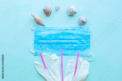 travel, vacation, mask, pandemic, epidemic, protective, antiseptic, antibacterial, glove, holiday, disinfection, hygiene, spring, holiday maker, 2020, ocean, shell, marin, safety, sunglasses, sea, tour tourism, protection, minimal, disease, isolation, quarantine, corona, text, space, copy, lay, summer, virus, flat, protect, rest, beach, medicine, spa, relax, tropical, blue