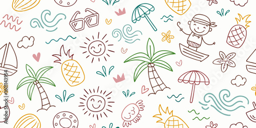 Summer Vacation Seamless Pattern: Kids' Doodle Beach Design