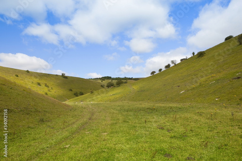 landscape, nature, vale, grass, hill, meadow, pasture, scenery, scenic, outdoors, rural, countryside, sky, blue, summer, flora, plant, grazing, field, farmland, farming