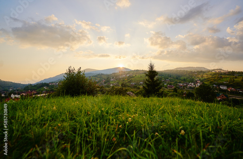 Summer village. Beautiful mountains landscape with green valley.