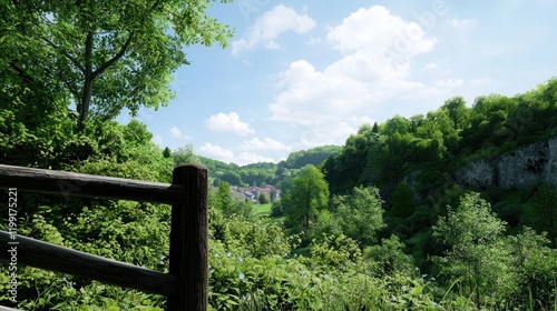 landscape, nature, scenery, village, tree, forest, green, summer, day, sun, sky, cloud, hill, view, scenic, rural, background, peaceful, tranquil, serene, calm, idylli, beautiful, pretty, picturesque, charming, timberland, foliage, lush, vibrant, bright, horizon, vista, overlook, perspective, distant, faraway, vale, countryside, environment, ecosystem, natural, wildlife, habitat, wood, fence, rail