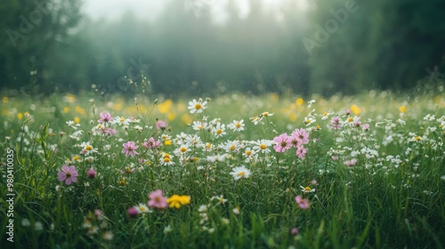 Summer Wildflowers in Meadow with Green Grass and Blurred Forest Background