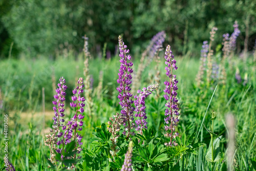 summer wild-growing blue-lilac lupine flowers with green leaves in the grass