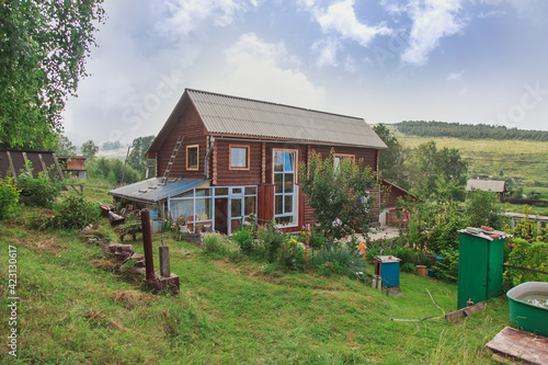 summer wooden house in a birch grove. camping in the woods. tourist base for travelers recreation. eco-friendly construction