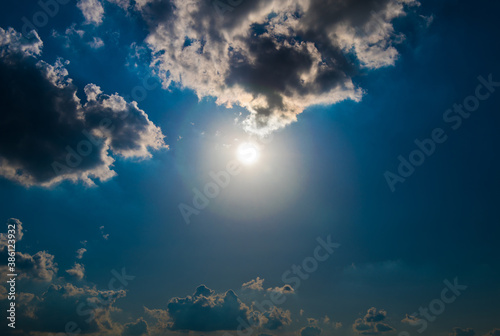 Sun and black clouds in the dark blue sky