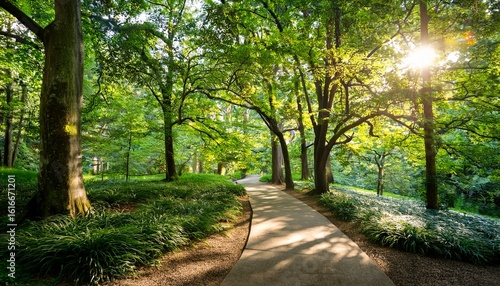 sun dappled path winding through a lush park forest trees creating a natural canopy overhead peaceful serene scene perfect for relaxation and nature appreciation exploration natural plants