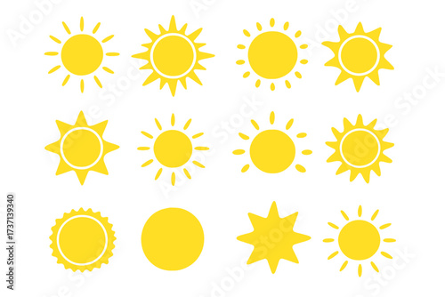 sun, icon, set, vector, illustration, symbol, yellow, isolated, collection, design, graphic, element, summer, sunlight, sunshine, sunny, light, ray, heat, hot, warm, weather, sky, sunrise, sunset, dawn, morning, daytime, flat, simple, abstract, cartoon, doodle, silhouette, shape, circle, star, nature, energy, happy, logotype, sticker, clip art, bright, solar