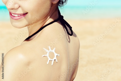 sun, suncream, skin, applying, back, beach, beautiful, beauty, blue, body, bottle, care, closeup, cream, drawing, face, female, girl, holding, lotion, people, positive, protect, protection, sea, shape, shoulder, skincare