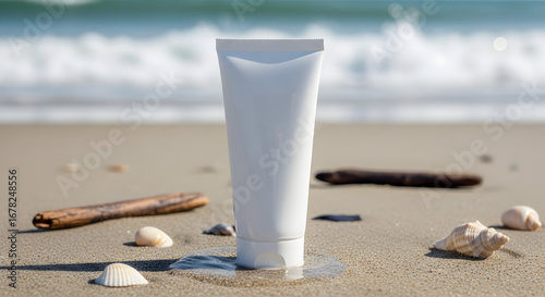 Sun Protection Essentials: Blank White Tube of Sunscreen on Sandy Beach Shoreline with Seashells and Ocean Waves, Perfect for Summer Skin Care and Cosmetic Product Mockups
