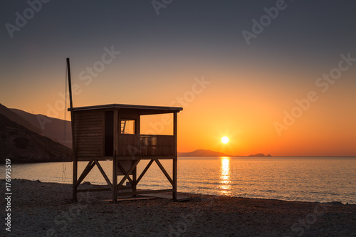 Sun setting behind lifeguard tower on Ostriconi beach in Corsica