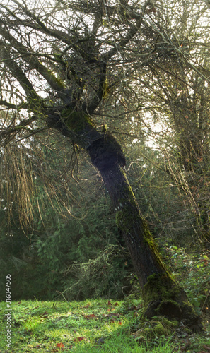 bent, misshapen, weeping, forest, tree, tree, nature, autumn, winter, landscape, wood, sun, light, fog, green, path, wood, sunlight, timberland, fall, mist, pine, foliage, season, leaf, park, leaf, sunny, shine, hemlock, maple, alder, cedar, lichen