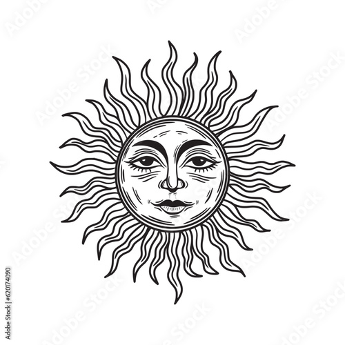Sun with a face. Bohemian illustration. Mystical element for design in boho style, logo, tattoo