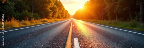 Sun-baked asphalt road with sharp white lane markers , markings, dividing line