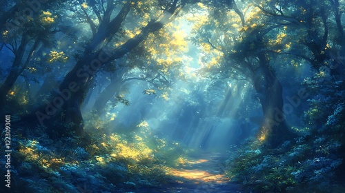 Sunbeams illuminate a mystical forest path, dappled light on lush green and blue foliage, creating an ethereal atmosphere. Dark trees frame a bright